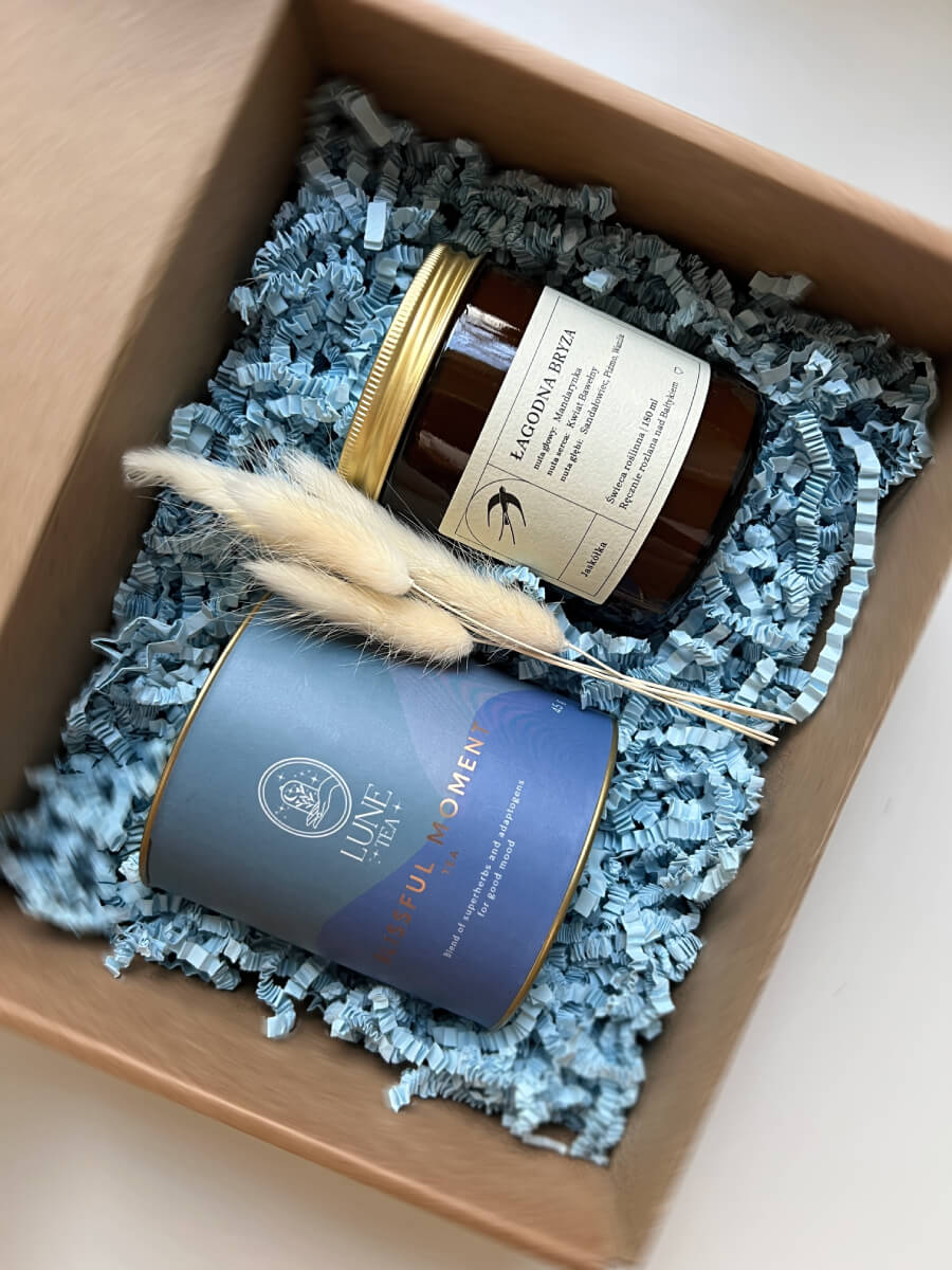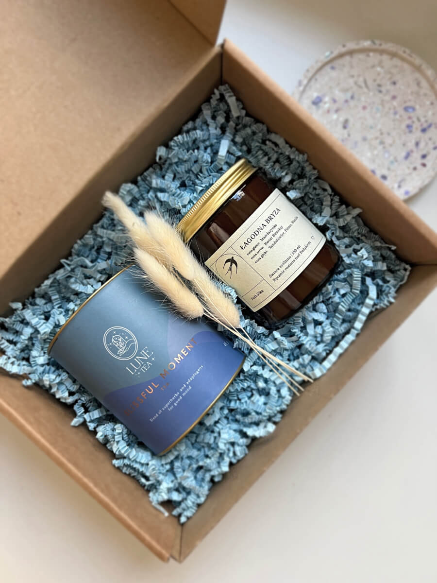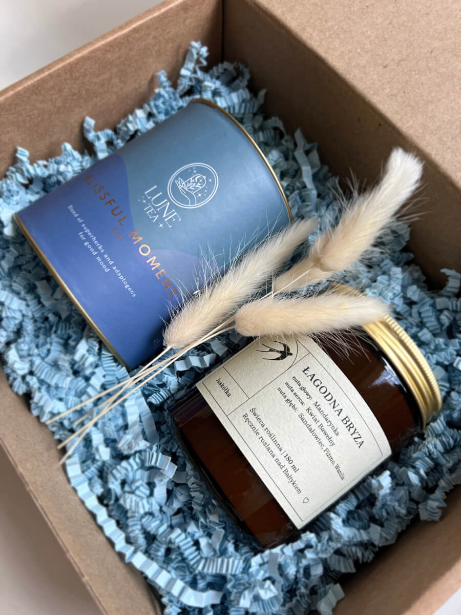 Połączenie świecy i niebieskiej herbaty pozwoli na chwilę oddechu, kiedy wszystko pędzi do przodu. Podaruj to pudełeczko osobie, której się przyda!